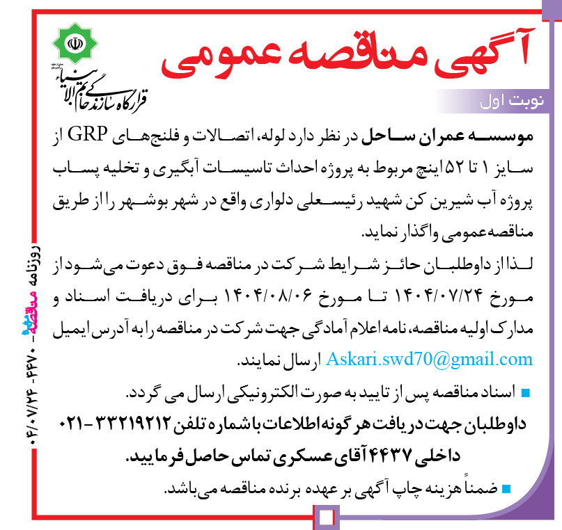 موسسه عمران ساحل در نظر دارد لوله، اتصالات و فلنجهای GRP از سایز ۱ تا ۵۲ اینچ مربوط به پروژه احداث تاسیسات آبگیری و تخلیه پساب پروژه آب شیرین کن شهید رئیسعلی دلواری واقع در شهر بوشهر را از طريق مناقصه عمومی واگذار نماید.