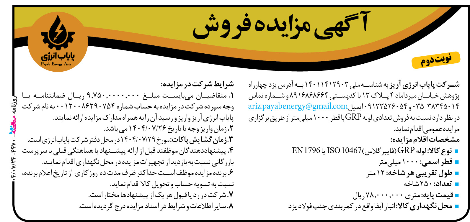 شرکت پایاب انرژی آریز به شناسه ملی ۱۴۰۱۱۴۱۲۹۰۳ به آدرس یزد چهارراه پژوهش خیابان میرداماد ۴ پلاک ۱۳ با کدپستی ۸۹۱۶۸۶۸۶۶۴ و شماره تماس ۳۸۳۴۵۰۱۴-۰۳۵ و ۰۹۱۳۳۵۲۶۰۵۴ ایمیل ariz.payabenergy@gmail.com در نظر دارد نسبت به فروش تعدادی لوله GRP با قطر ۱۰۰۰ میلیمتر از طریق برگزاری مزایده عمومی اقدام نماید.