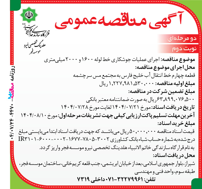 آگهی مناقصه عمومی یک مرحله ای موضوع مناقصه: اجرای عملیات جوشکاری خط لوله ۱۶۰۰ و ۲۰۰۰ میلیمتری محل اجرای موضوع مناقصه: قطعه چهارم خط انتقال آب خلیج فارس به مجتمع مس سرچشمه مبلغ اولیه مناقصه: ۱٫۲۲۷٫۹۸۱٫۵۳۰٫۰۰۰ ریال مبلغ تضمین شرکت در مناقصه: ۶۳٫۸۹۹٫۰۷۶٫۵۰۰ ریال به صورت ضمانتنامه معتبر بانکی تاریخ دریافت اسناد: مورخ ۲۱/۰۷/۱۴۰۴ لغایت […]