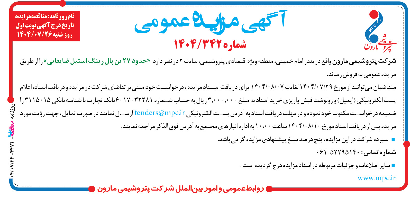 « آگهي مزايده عمومي» شماره ۳۴۲/۱۴۰۴ شرکت پتروشيمي مارون واقع در بندر امام خميني، منطقه ويژه اقتصادي پتروشيمي، سايت ۲ در نظر دارد «حدود ۲۷ تن پال رينگ استيل ضايعاتي» را از طريق مزايده عمومي به فروش رساند . متقاضيان ميتوانند از مورخ ۲۹/۰۷/۱۴۰۴ لغايت ۰۷/۰۸/۱۴۰۴ براي دريافت اسناد مزايده ، درخواست خود مبني بر […]