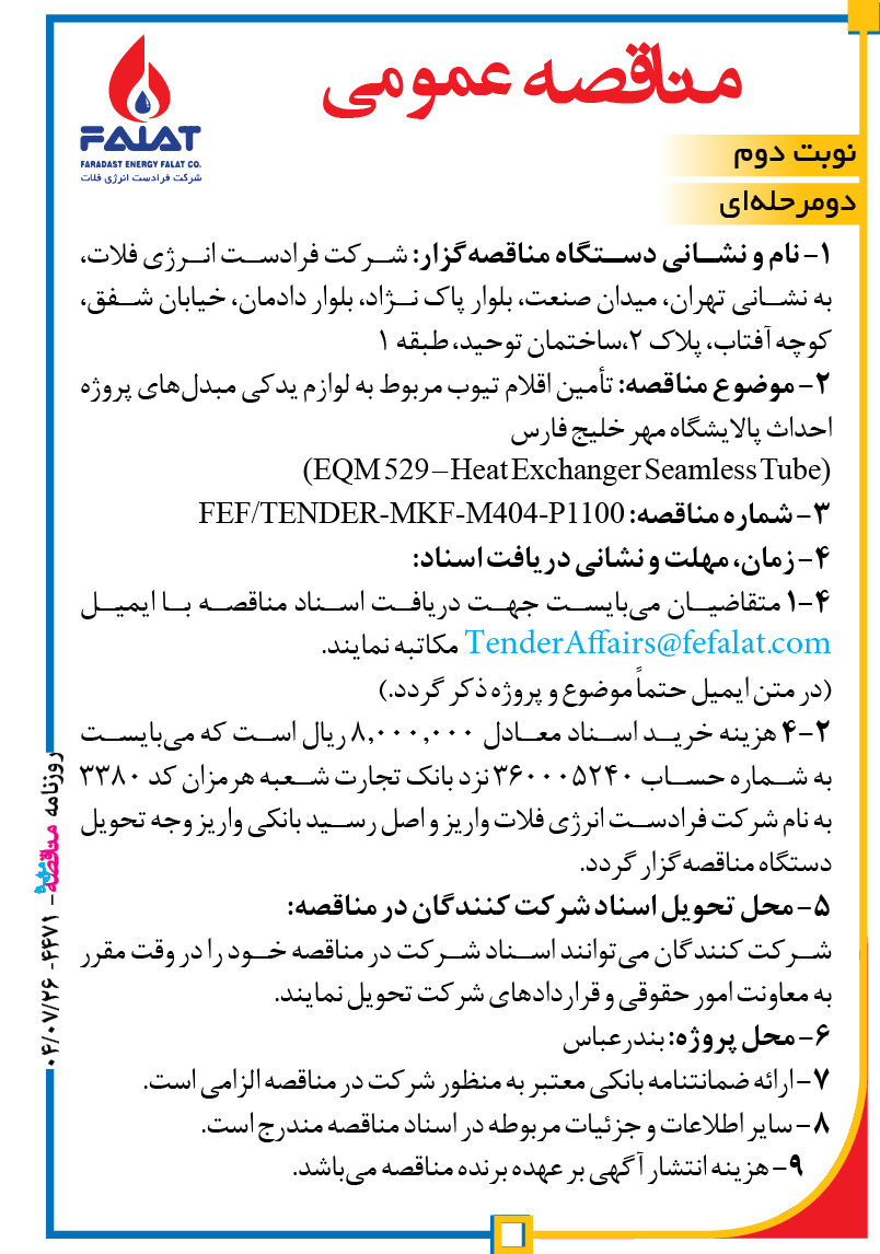 مناقصه عمومی دو مرحلهای نام و نشانی دستگاه مناقصهگزار: شرکت فرادست انرژی فلات، به نشانی تهران، میدان صنعت، بلوار پاک نژاد، بلوار دادمان، خیابان شفق، کوچه آفتاب، پلاک ۲،ساختمان توحید، طبقه ۱ موضوع مناقصه: تأمین اقلام تیوب مربوط به لوازم یدکی مبدلهای پروژه احداث پالایشگاه مهر خلیج فارس (EQM 529 – Heat Exchanger Seamless Tube) […]