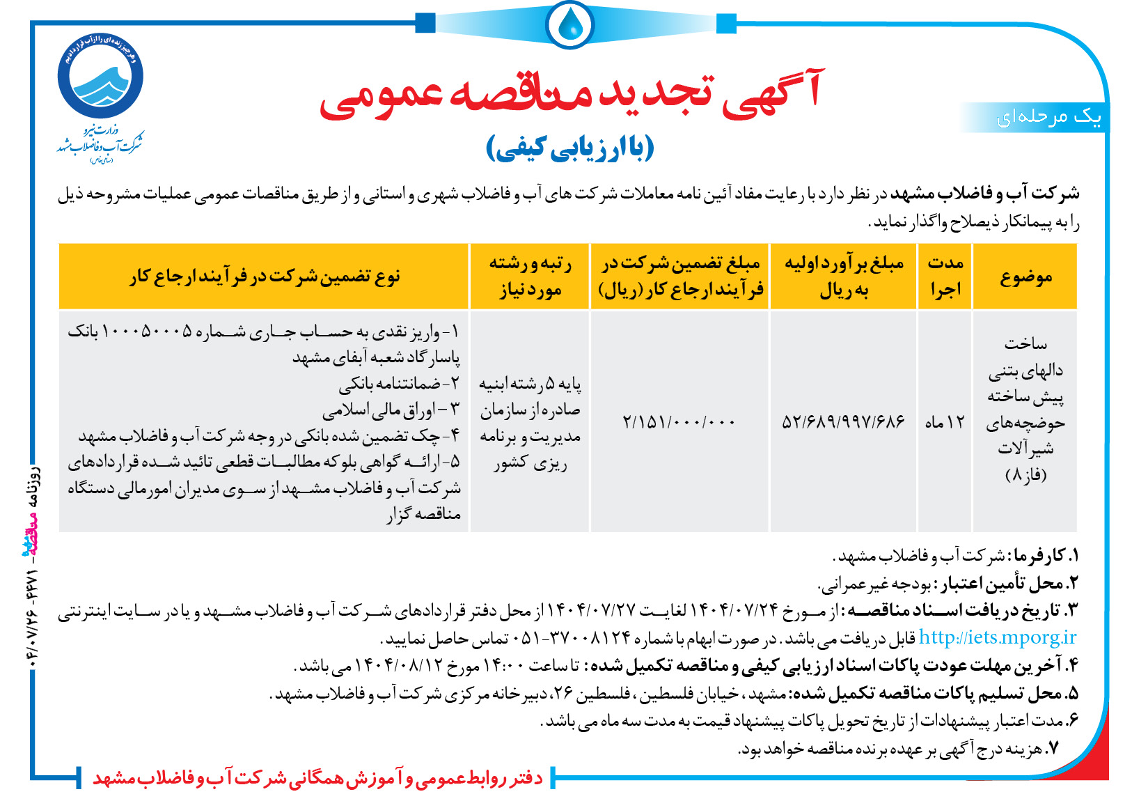 ۳٫ تاریخ دریافت اسناد مناقصه : از مورخ ۲۴/۰۷/۱۴۰۴ لغایت ۲۷/۰۷/۱۴۰۴ از محل دفتر قراردادهای شرکت آب و فاضلاب مشهد و یا در سایت اینترنتی http://iets.mporg.ir قابل دریافت می باشد . در صورت ابهام با شماره ۳۷۰۰۸۱۲۴-۰۵۱ تماس حاصل نمایید .