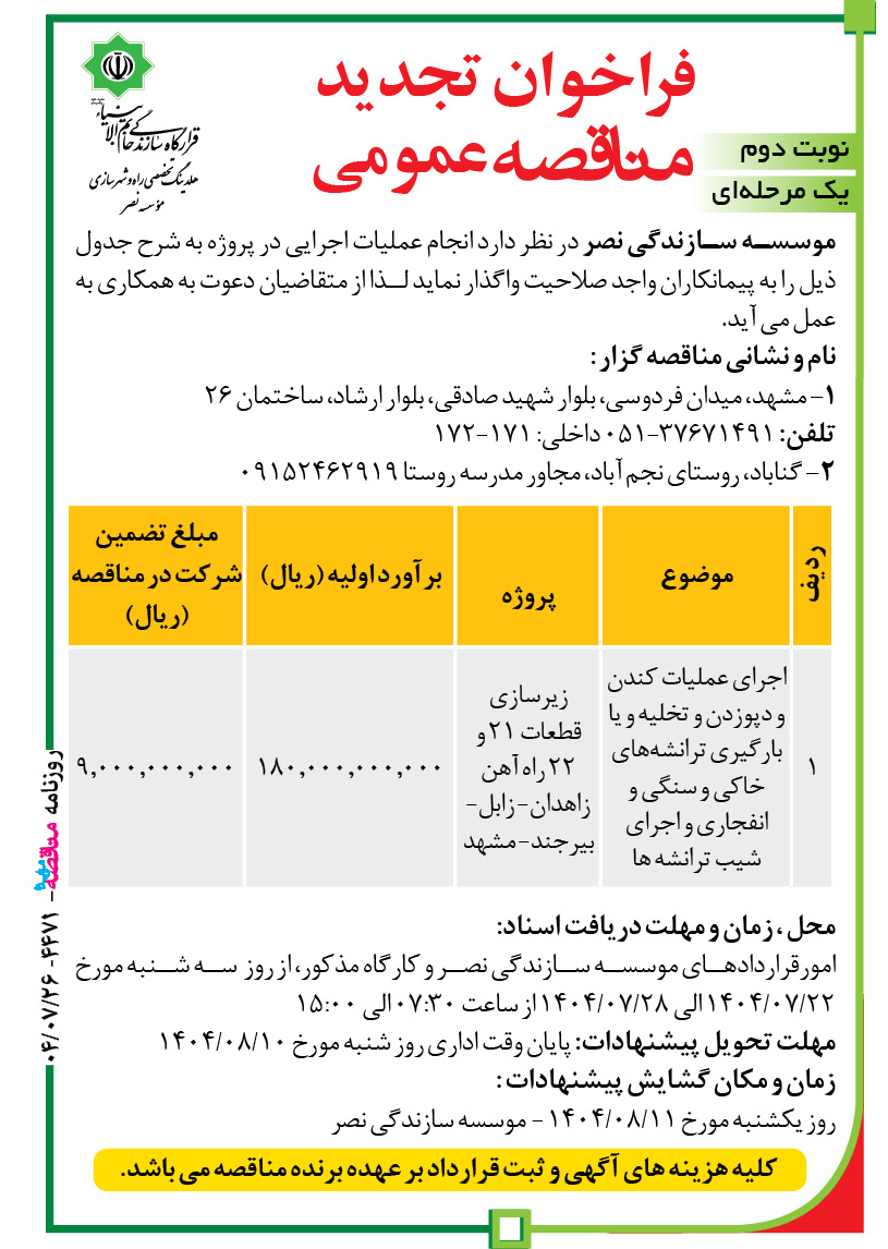 فراخوان تجدید مناقصه عمومی یک مرحله ای موسسه سازندگی نصر در نظر دارد انجام عملیات اجرایی در پروژه به شرح جدول ذیل را به پیمانکاران واجد صلاحیت واگذار نماید لذا از متقاضیان دعوت به همکاری به عمل می آید. نام و نشانی مناقصه گزار : ۱-مشهد، میدان فردوسی، بلوار شهید صادقی، بلوار ارشاد، ساختمان ۲۶، […]