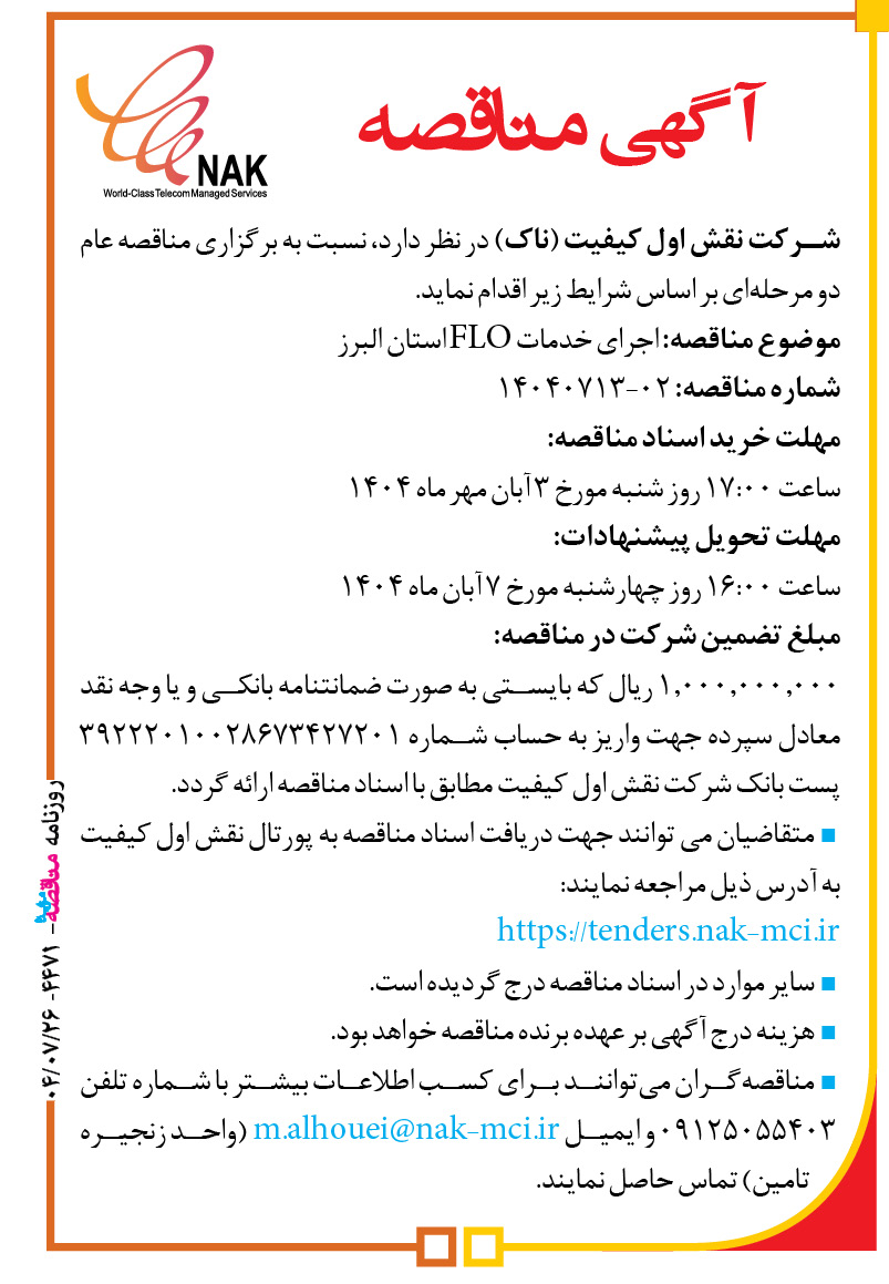 آگهی مناقصه شرکت نقش اول کیفیت (ناک) در نظر دارد، نسبت به برگزاری مناقصه عام دو مرحلهای بر اساس شرایط زیر اقدام نماید. موضوع مناقصه: اجرای خدمات نگهداری، نصب و راه اندازی سایت های اضطراری استان البرز شماره مناقصه: ۰۱-۱۴۰۴۰۷۱۳ مهلت خرید اسناد مناقصه: ساعت ۱۷:۰۰ روز دوشنبه مورخ ۲۸ مهر ماه ۱۴۰۴ مهلت تحویل […]