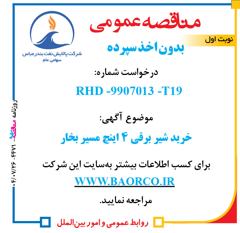 آگهی مناقصه عمومی بدون اخذ سپرده درخواست شماره: RHD -9907013 -T19 موضوع آگهی: خرید شیر برقی ۴ اینچ مسیر بخار برای کسب اطلاعات بیشتر به سایت این شرکت WWW.BAORCO.IR مراجعه نمایید. روابط عمومی و امور بین الملل