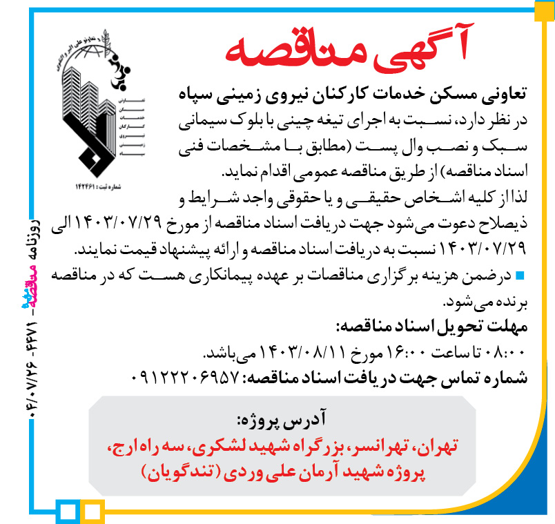 تعاونی مسکن خدمات کارکنان نیروی زمینی سپاه در نظر دارد، نسبت به اجرای تیغه چینی با بلوک سیمانی سبک و نصب وال پست (مطابق با مشخصات فنی اسناد مناقصه) از طریق مناقصه عمومی اقدام نماید. لذا از کلیه اشخاص حقیقی و یا حقوقی واجد شرایط و ذیصلاح دعوت میشود جهت دریافت اسناد مناقصه از مورخ […]