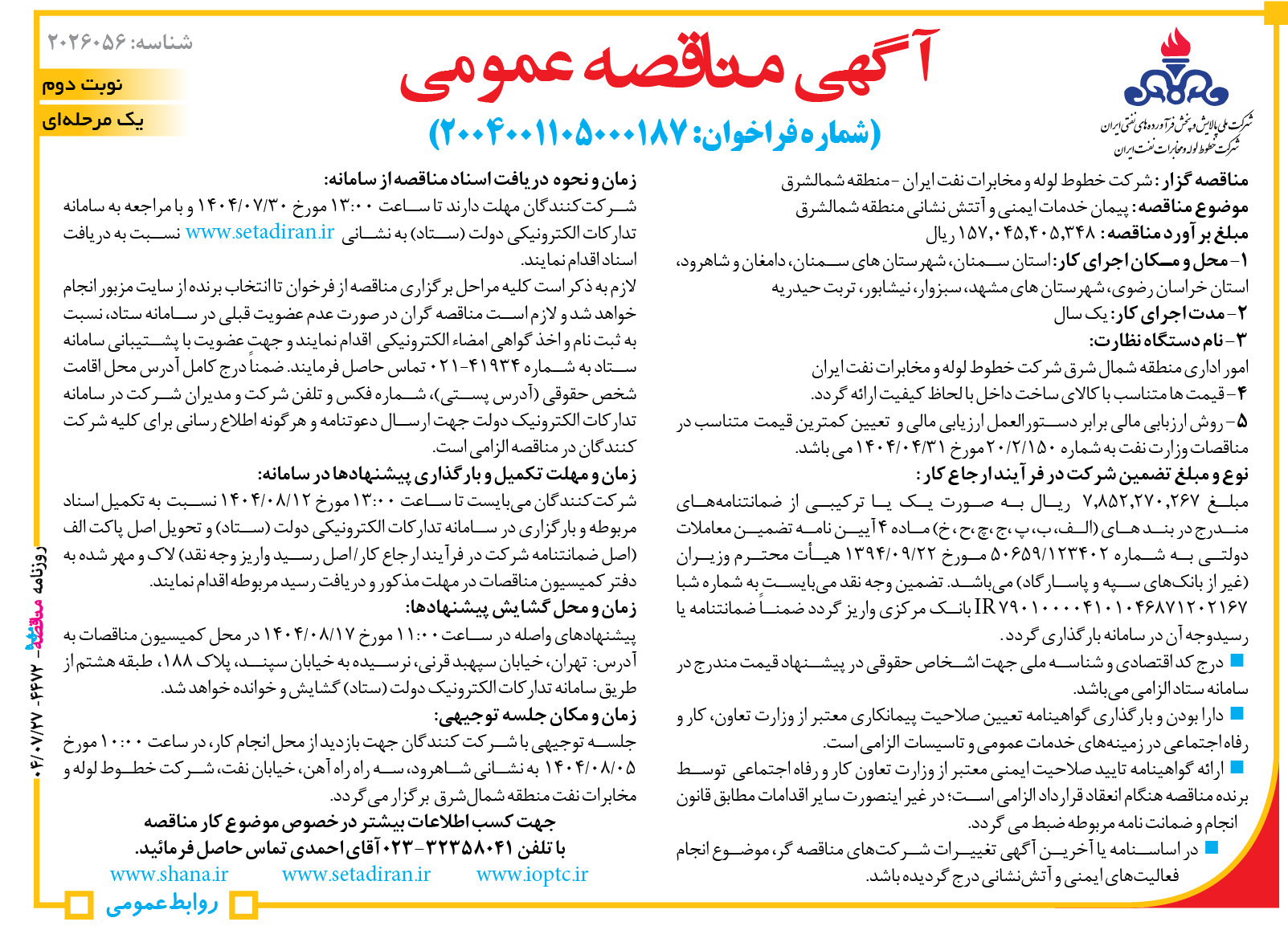 آگهي مناقصه عمومي يك مرحله اي(شماره فراخوان: ۲۰۰۴۰۰۱۱۰۵۰۰۰۱۸۷) شناسه: ۲۰۲۶۰۵۶ مناقصه گزار : شركت خطوط لوله و مخابرات نفت ايران – منطقه شمالشرق موضوع مناقصه : پيمان خدمات ایمنی و آتتش نشانی منطقه شمالشرق مبلغ برآورد مناقصه : ۱۵۷٫۰۴۵٫۴۰۵٫۳۴۸ ریال ۱- محل و مكان اجراي كار: استان سمنان، شهرستان های سمنان، دامغان و شاهرود، استان […]