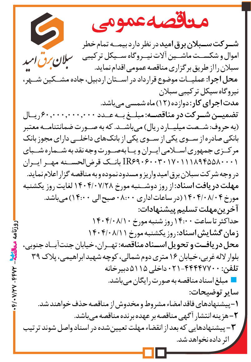 شرکت سبلان برق امید در نظر دارد بیمه تمام خطر اموال و شکست ماشین آلات نیروگاه سیکل ترکیبی سبلان را از طریق برگزاری مناقصه عمومی اقدام نماید.