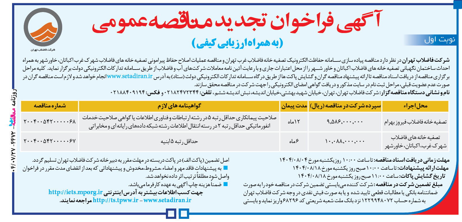 شركت فاضلاب تهران در نظر دارد مناقصه پیاده سازی سامانه حفاظت الکترونیک تصفیه خانه فاضلاب غرب تهران و مناقصه عملیات اصلاح حفاظ پیراموني تصفیه خانه هاي فاضلاب شهرک غرب اكباتان، خاورشهر به همراه احداث ساختمان نگهباني تصفیه خانه هاي فاضلاب اكباتان و خاور شهر را از محل اعتبارات جاری و با رعايت آئین نامه معاملات شرکتهای آب و فاضلاب از طریق سامانه تدارکات الکترونیکی دولت برگزار نماید. کلیه مراحل برگزاری مناقصه از دریافت اسناد مناقصه تا ارائه پیشنهاد مناقصه گران و گشایش پاکت ها از طریق درگاه سامانه تدارکات الکترونیکی دولت (ستاد) به آدرس www.setadiran.ir انجام خواهد شد و لازم است مناقصه گران در صورت عدم عضویت قبلی، مراحل ثبت نام در سایت مذکور و دریافت گواهی امضای الکترونیکی را جهت شرکت در مناقصه محقق سازند.