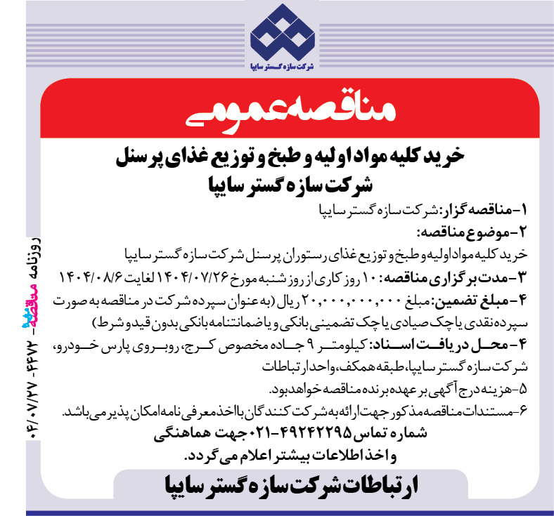 مناقصه عمومی خرید کلیه مواد اولیه و طبخ و توزیع غذای پرسنل شرکت سازه گستر سایپا