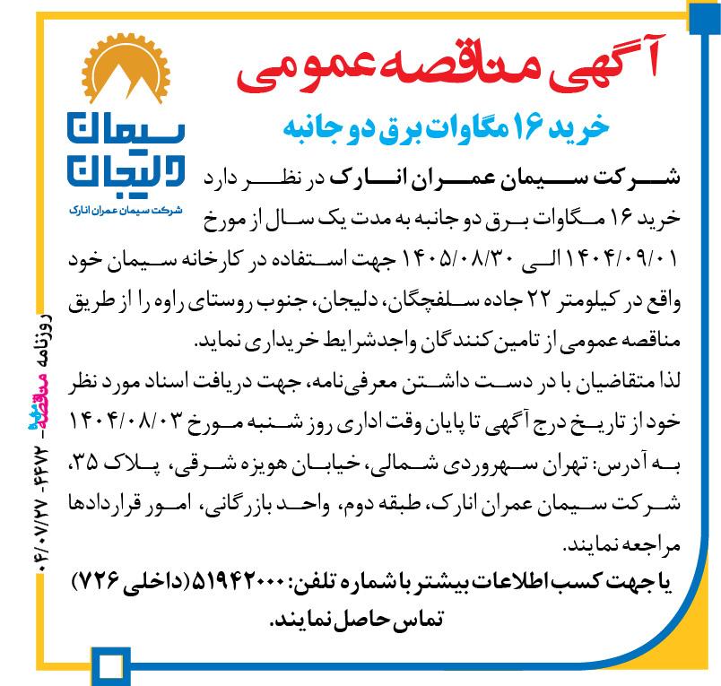 شرکت سیمان عمران انارک در نظر دارد خرید ۱۶ مگاوات برق دو جانبه به مدت یک سال از مورخ ۰۱/۰۹/۱۴۰۴ الی ۳۰/۰۸/۱۴۰۵ جهت استفاده در کارخانه سیمان خود واقع در کیلومتر ۲۲ جاده سلفچگان، دلیجان، جنوب روستای راوه را از طریق مناقصه عمومی از تامینکنندگان واجدشرایط خریداری نماید. لذا متقاضیان با در دست داشتن معرفینامه، جهت دریافت اسناد مورد نظر خود از تاریخ درج آگهی تا پایان وقت اداری روز شنبه مورخ ۰۳/۰۸/۱۴۰۴ به آدرس: تهران سهروردی شمالی، خیابان هویزه شرقی، پلاک ۳۵، شرکت سیمان عمران انارک، طبقه دوم، واحد بازرگانی، امور قراردادها مراجعه نمایند.