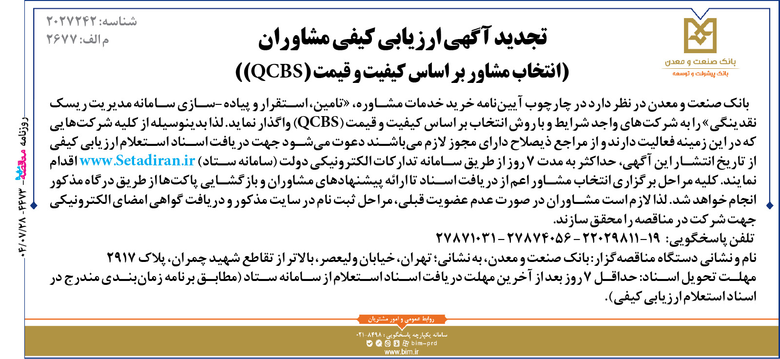 بانك صنعت و معدن در نظر دارد در چارچوب آییننامه خرید خدمات مشاوره، «تامین، استقرار و پیادهسازی سامانه مدیریت ریسک نقدینگی» را به شركتهاي واجد شرايط و با روش انتخاب بر اساس کیفیت و قیمت (QCBS) واگذار نمايد. لذا بدينوسيله از كليه شركتهايي كه در اين زمينه فعاليت دارند و از مراجع ذیصلاح دارای مجوز لازم میباشند دعوت ميشود جهت دریافت اسناد استعلام ارزيابي كيفي از تاريخ انتشار اين آگهي، حداکثر به مدت ۷ روز از طريق سامانه تداركات الكترونيكي دولت (سامانه ستاد) www.Setadiran.ir اقدام نمايند. كليه مراحل برگزاري انتخاب مشاور اعم از دريافت اسناد تا ارائه پيشنهادهای مشاوران و بازگشايي پاكتها از طريق درگاه مذكور انجام خواهد شد. لذا لازم است مشاوران در صورت عدم عضويت قبلي، مراحل ثبت نام در سايت مذكور و دريافت گواهي امضاي الكترونيكي جهت شركت در مناقصه را محقق سازند.