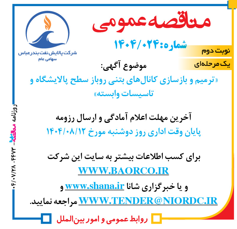 آگهی مناقصه عمومی یک مرحله ای شماره :۰۲۴/۱۴۰۴ موضوع آگهی: « ترمیم و بازسازی کانالهای بتنی روباز سطح پالایشگاه و تاسیسات وابسته» آخرین مهلت اعلام آمادگی و ارسال رزومه پایان وقت اداری روز دوشنبه مورخ ۱۲/۰۸/۱۴۰۴ برای کسب اطلاعات بیشتر به سایت این شرکت WWW.BAORCO.IR و یا خبرگزاری شانا www.shana.ir و TENDER@NIORDDC.IR مراجعه نمایید. روابط […]