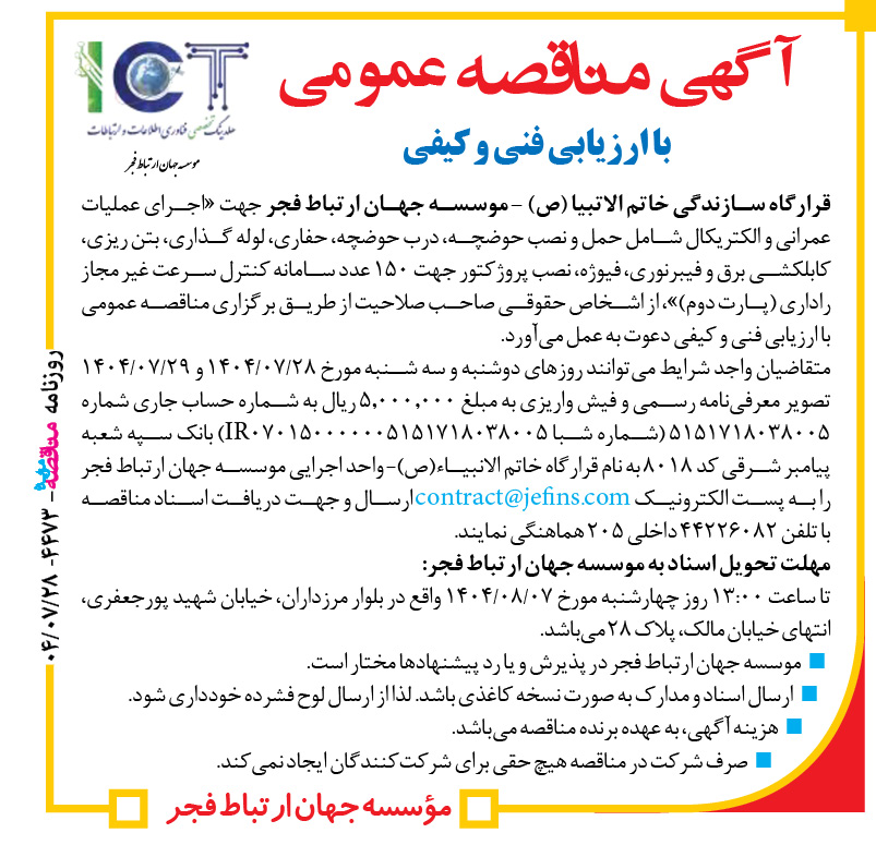 قرارگاه سازندگی خاتم الاتبیا (ص) – موسسه جهان ارتباط فجر جهت «اجرای عملیات عمرانی و الکتریکال شامل حمل و نصب حوضچه، درب حوضچه، حفاری، لوله گذاری، بتن ریزی، کابلکشی برق و فیبرنوری، فیوژه، نصب پروژکتور جهت ۱۵۰ عدد سامانه کنترل سرعت غیر مجاز راداری (پارت دوم)»، از اشخاص حقوقی صاحب صلاحیت از طریق برگزاری مناقصه عمومی با ارزیابی فنی و کیفی دعوت به عمل میآورد. متقاضیان واجد شرایط میتوانند روزهای دوشنبه و سه شنبه مورخ ۲۸/۰۷/۱۴۰۴ و ۲۹/۰۷/۱۴۰۴ تصویر معرفینامه رسمی و فیش واریزی به مبلغ ۵٫۰۰۰٫۰۰۰ ریال به شماره حساب جاری شماره ۵۱۵۱۷۱۸۰۳۸۰۰۵ (شماره شبا ۰۷۰۱۵۰۰۰۰۰۰۵۱۵۱۷۱۸۰۳۸۰۰۵IR) بانک سپه شعبه پیامبر شرقی کد ۸۰۱۸ به نام قرارگاه خاتم الانبیاء(ص)- واحد اجرایی موسسه جهان ارتباط فجر را به پست الکترونیک contract@jefins.com ارسال و جهت دریافت اسناد مناقصه با تلفن ۴۴۲۲۶۰۸۲ داخلی ۲۰۵ هماهنگی نمایند.