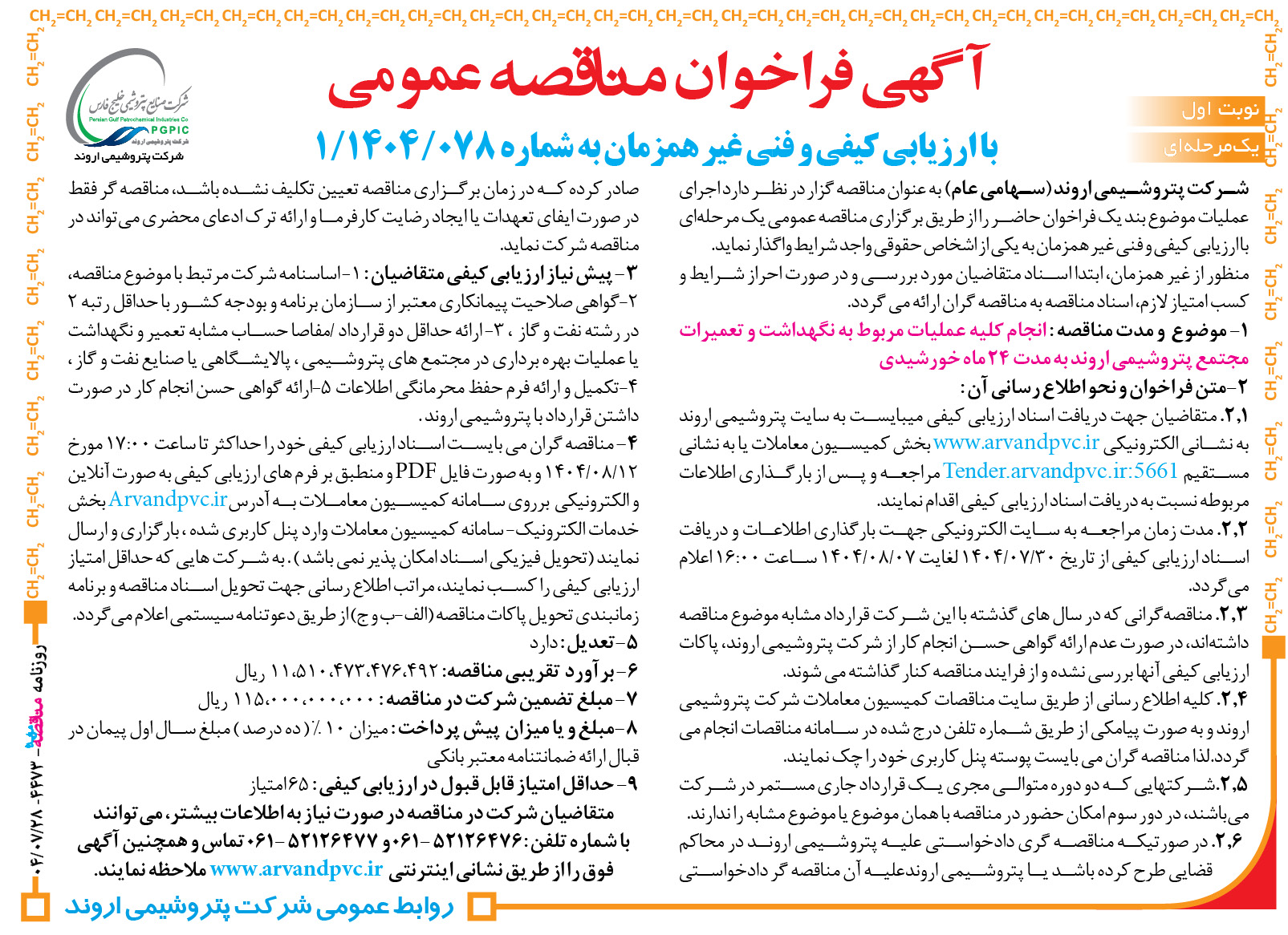 آگهی فراخوان مناقصه عمومی یک مرحله ای با ارزیابی کیفی و فنی غیر همزمان به شماره ۰۷۸/۱۴۰۴/۱ شرکت پتروشیمی اروند (سهامی عام) به عنوان مناقصه گزار در نظر دارد اجرای عملیات موضوع بند یک فراخوان حاضر را از طریق برگزاری مناقصه عمومی یک مرحله ای با ارزیابی کیفی و فنی غیر همزمان به یکی از […]