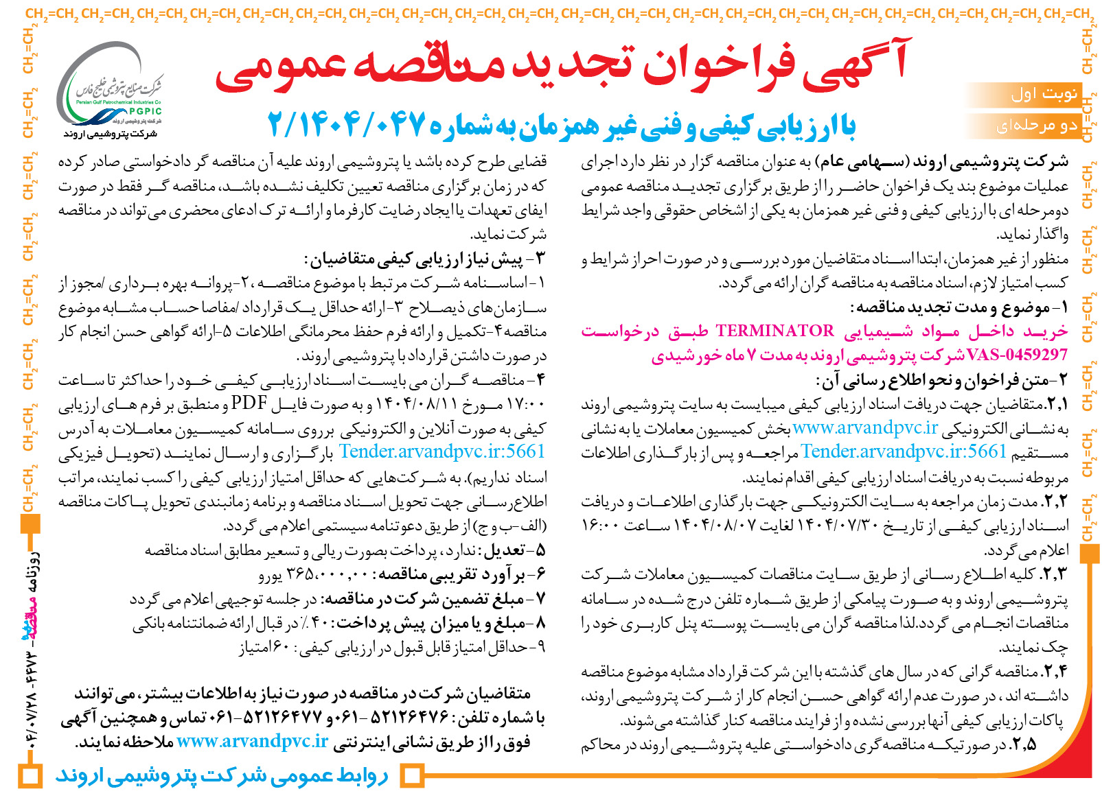 ۱- موضوع و مدت تجدید مناقصه : خرید داخل مواد شیمیایی TERMINATORطبق درخواست VAS-0459297شرکت پتروشیمی اروند به مدت ۷ ماه خورشیدی