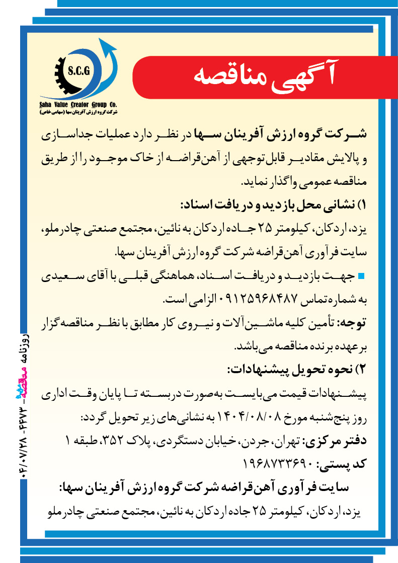 شرکت گروه ارزش آفرینان سها در نظر دارد عملیات جداسازی و پالایش مقادیر قابلتوجهی از آهنقراضه از خاک موجود را از طریق مناقصه عمومی واگذار نماید.