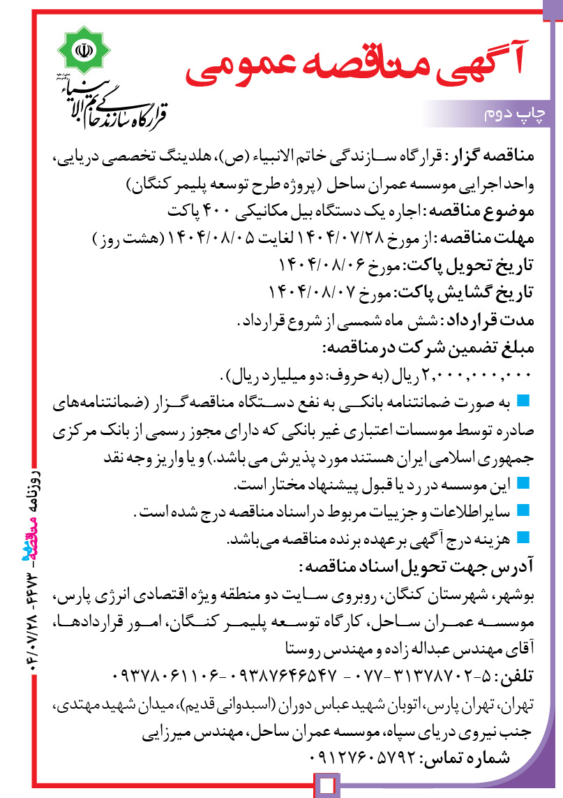 آگهي مناقصه عمومی (چاپ دوم) مناقصه گزار : قرارگاه سازندگی خاتم الانبیاء (ص)، هلدینگ تخصصی دریایی ،واحد اجرایی موسسه عمران ساحل (پروژه طرح توسعه پلیمر کنگان) موضوع مناقصه : اجاره یک دستگاه بیل مکانیکی ۴۰۰ پاکت مهلت مناقصه : از مورخ ۲۸/۰۷/۱۴۰۴ لغایت ۰۵/۰۸/۱۴۰۴ (هشت روز ) تاريخ تحويل پاكت: مورخ ۰۶/۰۸/۱۴۰۴ تاريخ گشایش پاكت: […]
