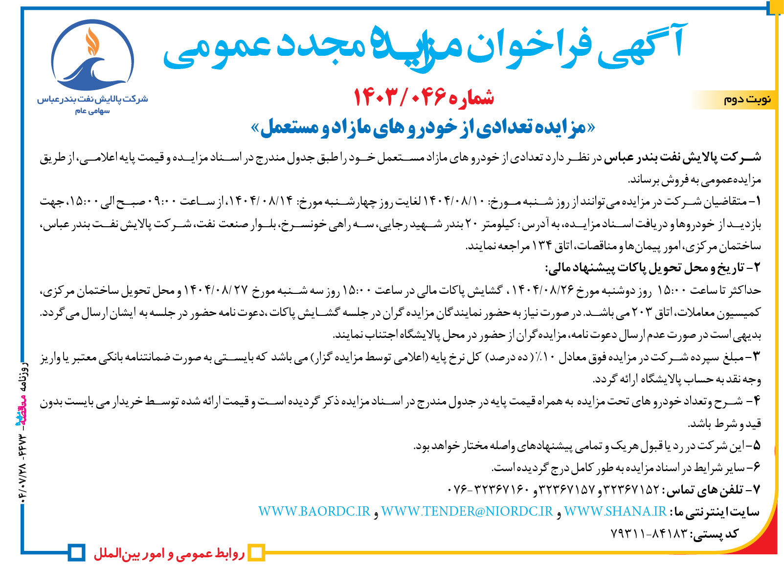 آگهی فراخوان مزایده عمومی شماره ۰۴۶ /۱۴۰۳ « مزایده تعدادی از خودرو های مازاد و مستعمل» شرکت پالایش نفت بندر عباس در نظر دارد تعدادی از خودرو های مازاد مستعمل خود را طبق جدول مندرج در اسناد مزایده و قیمت پایه اعلامی، از طریق مزایده عمومی به فروش برساند. متقاضیان شرکت در مزایده میتوانند از […]