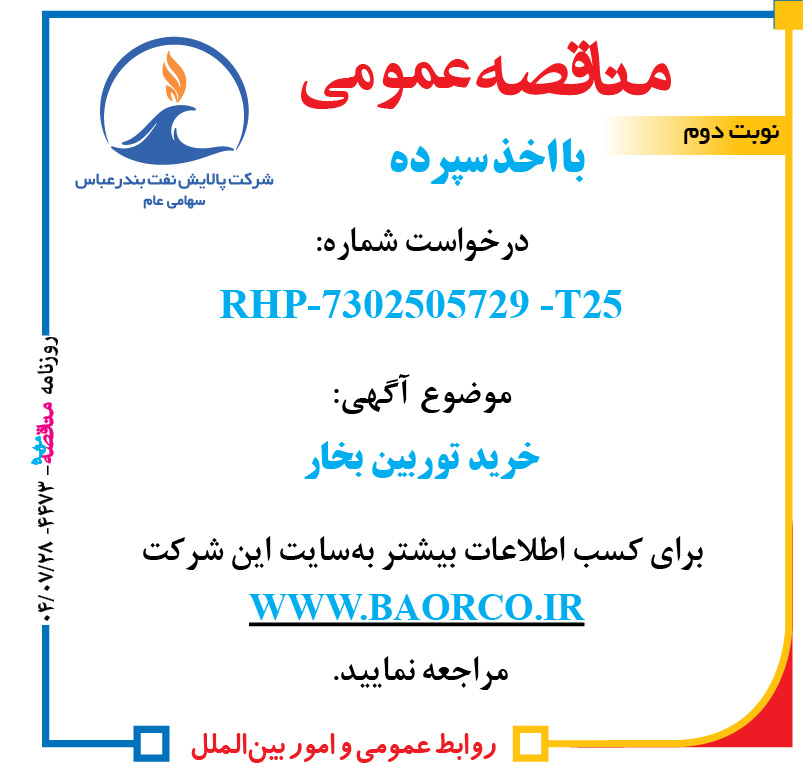 آگهی مناقصه عمومی با اخذ سپرده درخواست شماره: RHP-7302505729 -T25 موضوع آگهی: خرید توربین بخار برای کسب اطلاعات بیشتر به سایت این شرکت WWW.BAORCO.IR مراجعه نمایید. روابط عمومی و اموربین الملل