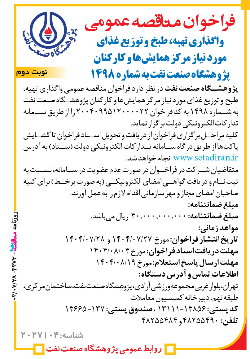 فراخوان مناقصه عمومی واگذاری تهیه، طبخ و توزیع غذای مورد نیاز مرکز همایشها و کارکنان پژوهشگاه صنعت نفت به شماره ۱۴۹۸
