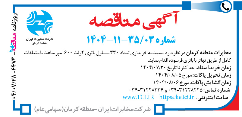 مخابرات منطقه کرمان در نظر دارد نسبت به خریداری تعداد ۳۳۰ سلول باتری ۲ولت ۶۰۰ آمپر ساعت با متعلقات کامل از طریق تهاتر با باتری فرسوده اقدام نماید.
