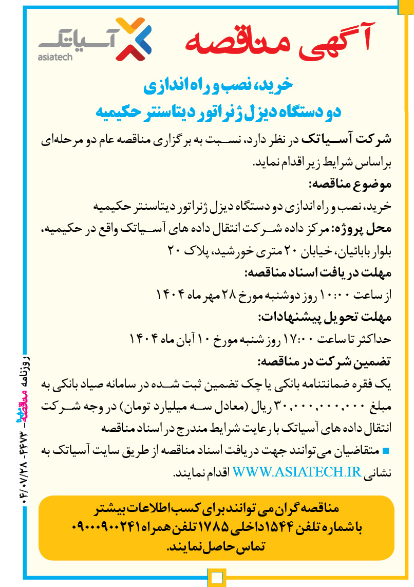 موضوع مناقصه: خرید، نصب و راه اندازی دو دستگاه دیزل ژنراتور دیتاسنتر حکیمیه