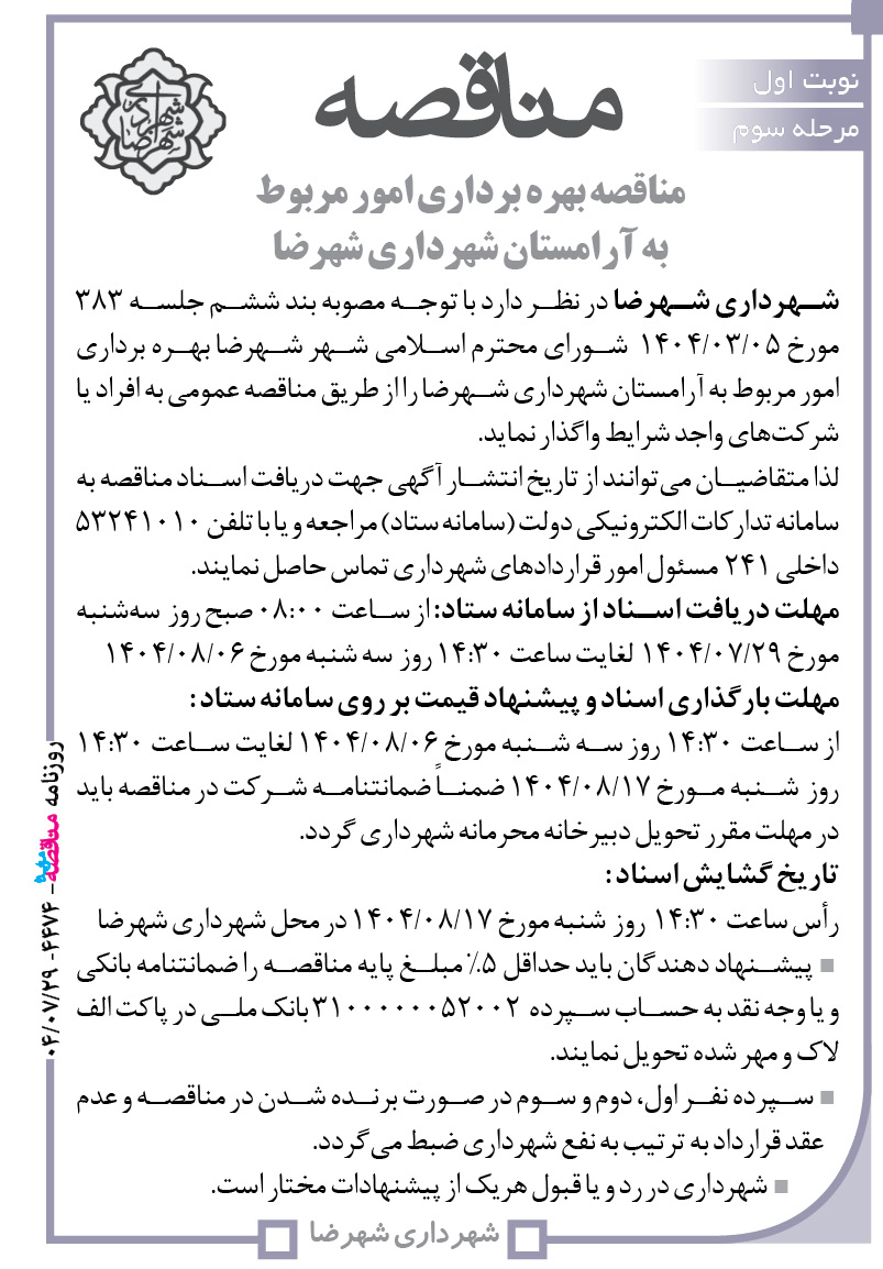 شهرداری شهرضا در نظر دارد با توجه مصوبه بند ششم جلسه ۳۸۳ مورخ ۰۵/۰۳/۱۴۰۴ شورای محترم اسلامی شهر شهرضا بهره برداری امور مربوط به آرامستان شهرداری شهرضا را از طریق مناقصه عمومی به افراد یا شرکت های واجد شرایط واگذار نماید.