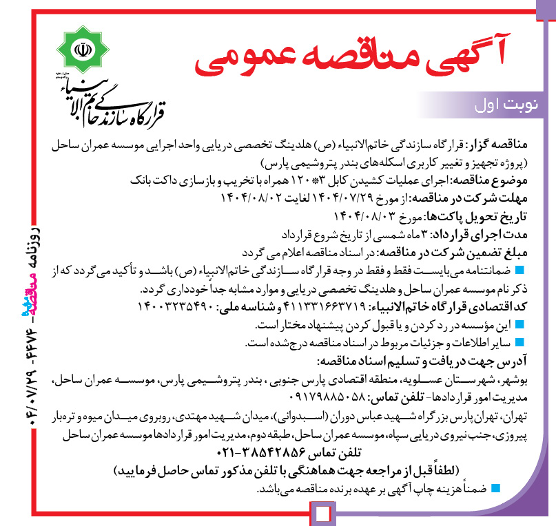 مناقصه گزار: قرارگاه سازندگی خاتمالانبیاء (ص) هلدینگ تخصصی دریایی واحد اجرایی موسسه عمران ساحل (پروژه تجهیز و تغییر کاربری اسکلههای بندر پتروشیمی پارس)