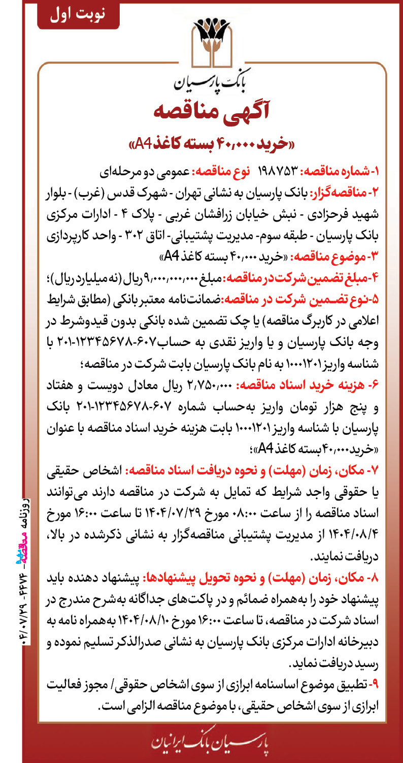 ۴۴۷۴ مناقصه – بانک پارسیان – خرید کاغذ