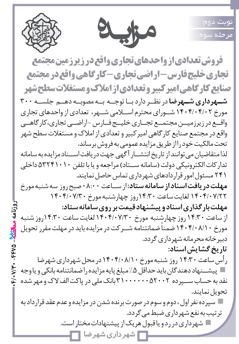 شهرداری شهرضا در نظر دارد با توجه به مصوبه دهم جلسه ۳۰۰ مورخ ۰۲/۰۴/۱۴۰۴ شورای محترم اسلامی شهر، تعدادی از واحدهای تجاری واقع در زیرزمین مجتمع تجاری خلیج فارس – اراضی تجاری،کارگاهی واقع در مجتمع صنایع کارگاهی امیرکبیر و تعدادی از املاک و مستغلات سطح شهر تحت مالکیت خود را از طریق مزایده عمومی به فروش برساند.