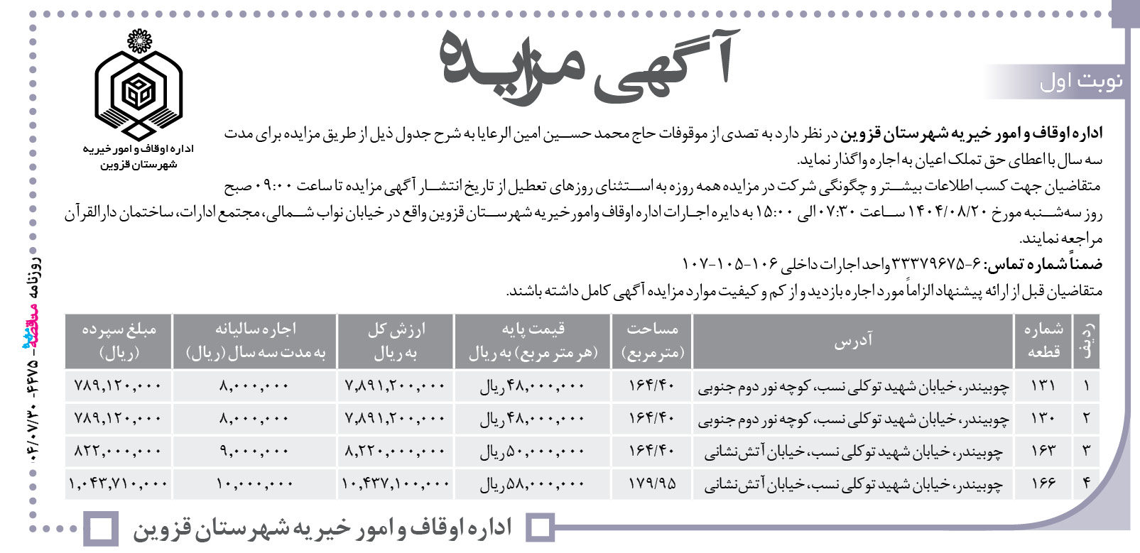 متقاضیان جهت کسب اطلاعات بیشتر و چگونگی شرکت در مزایده همه روزه به استثنای روزهای تعطیل از تاریخ انتشار آگهی مزایده تا ساعت ۰۹:۰۰ صبح روز سهشنبه مورخ ۲۰/۰۸/۱۴۰۴ ساعت ۰۷:۳۰ الی ۱۵:۰۰ به دایره اجـارات اداره اوقاف وامورخیریه شهرستان قزوین واقع در خیابان نواب شمالي، مجتمع ادارات، ساختمان دارالقرآن مراجعه نمایند.