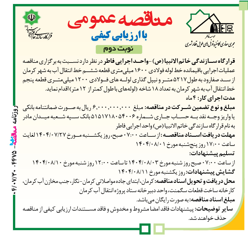 قرارگاه سازندگی خاتم الانبیا (ص)-واحد اجرایی فاطر در نظر دارد نسبت به برگزاری مناقصه عملیات اجرایی باقیمانده خط لوله فولادی ۱۶۰۰ میلیمتری قطعه ششم خط انتقال آب به شهر کرمان از سد صفارود به طول۵۲۱۷ متر و نیپل گذاری لوله های فولادی ۱۲۰۰ میلیمتری قطعه پنجم خط انتقال آب به شهر کرمان به تعداد ۱۸ شاخه (لوله های با طول کمتر از ۱۲ متر) اقدام نماید.