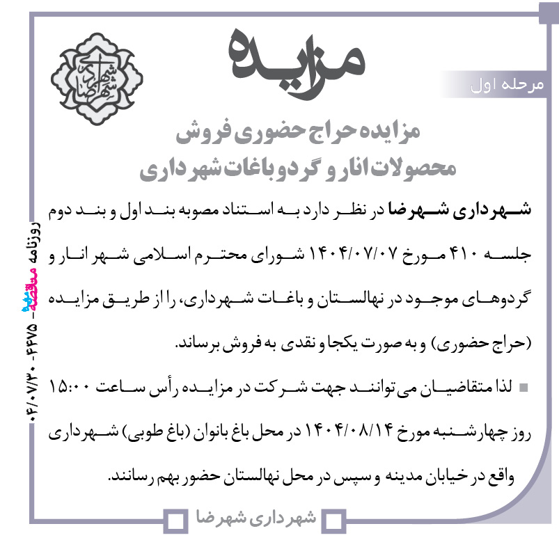 شهرداری شهرضا در نظر دارد به استناد مصوبه بند اول و بند دوم جلسه ۴۱۰ مورخ ۰۷/۰۷/۱۴۰۴ شورای محترم اسلامی شهر انار و گردوهای موجود در نهالستان و باغات شهرداری، را از طریق مزایده (حراج حضوری) و به صورت یکجا و نقدی به فروش برساند.