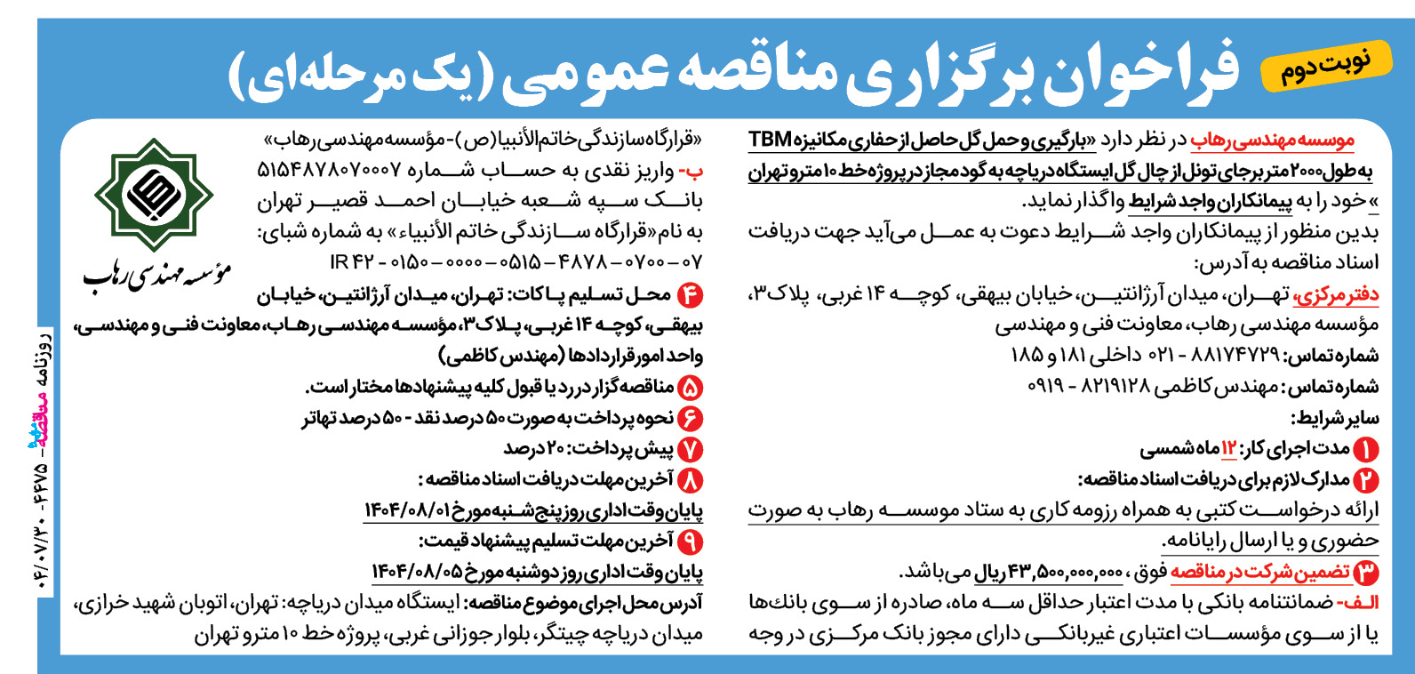 فراخوان برگزاری مناقصه عمومی یک مرحله ای موسسه مهندسی رهاب در نظر دارد «حمل گل حاصل از حفاری مکانیزه TBM به طول۲۰۰۰ متر برجای تونل از چال گل ایستگاه دریاچه به گود مجاز در پروژه خط ۱۰ مترو تهران » خود را به پیمانکاران واجد شرایط واگذار نماید. بدین منظور از پیمانکاران واجد شرایط دعوت […]