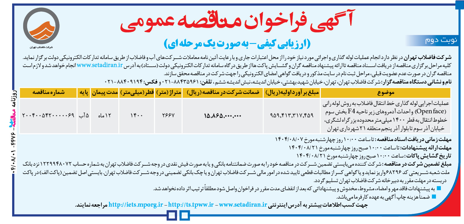 شركت فاضلاب تهران در نظر دارد انجام عملیات لوله گذاری و اجرائی مورد نیاز خود را از محل اعتبارات جاری و با رعايت آئین نامه معاملات شرکتهای آب و فاضلاب از طریق سامانه تدارکات الکترونیکی دولت برگزار نماید. کلیه مراحل برگزاری مناقصه از دریافت اسناد مناقصه تا ارائه پیشنهاد مناقصه گران و گشایش پاکت ها از طریق درگاه سامانه تدارکات الکترونیکی دولت (ستاد) به آدرس www.setadiran.ir انجام خواهد شد و لازم است مناقصه گران در صورت عدم عضویت قبلی، مراحل ثبت نام در سایت مذکور و دریافت گواهی امضای الکترونیکی را جهت شرکت در مناقصه محقق سازند.
