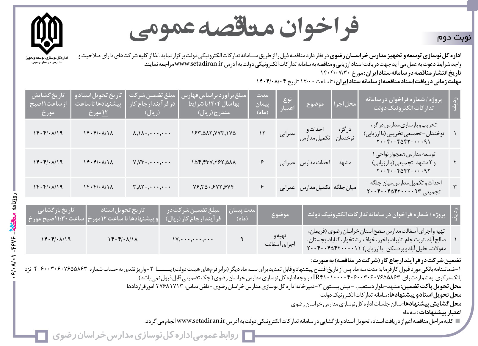 محل تحویل پاکت تضمین: مشهد- بلوار دستغیب – نبش بیستون ۳ – دبیرخانه اداره کل نوسازی مدارس خراسان رضوی – تلفن تماس: ۳۷۶۸۱۷۱۳ امورقراردادها