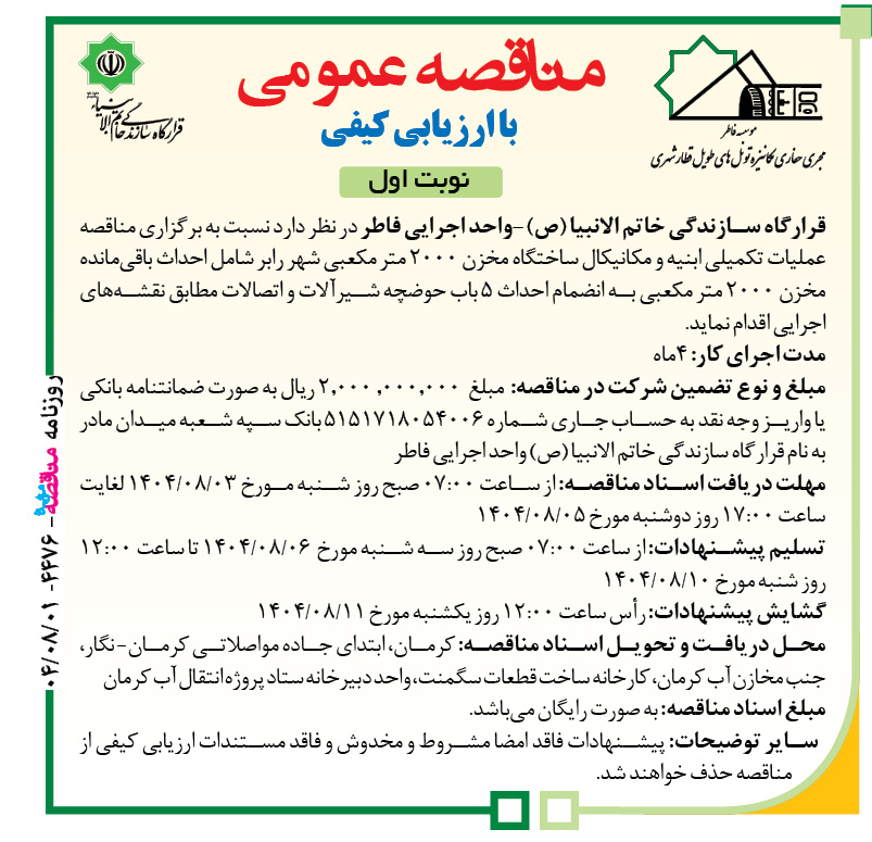 قرارگاه سازندگی خاتم الانبیا (ص)-واحد اجرایی فاطر در نظر دارد نسبت به برگزاری مناقصه عملیات تکمیلی ابنیه و مکانیکال ساختگاه مخزن ۲۰۰۰ متر مکعبی شهر رابر شامل احداث باقی مانده مخزن ۲۰۰۰ متر مکعبی به انضمام احداث ۵ باب حوضچه شیرآلات و اتصالات مطابق نقشه های اجرایی اقدام نماید.