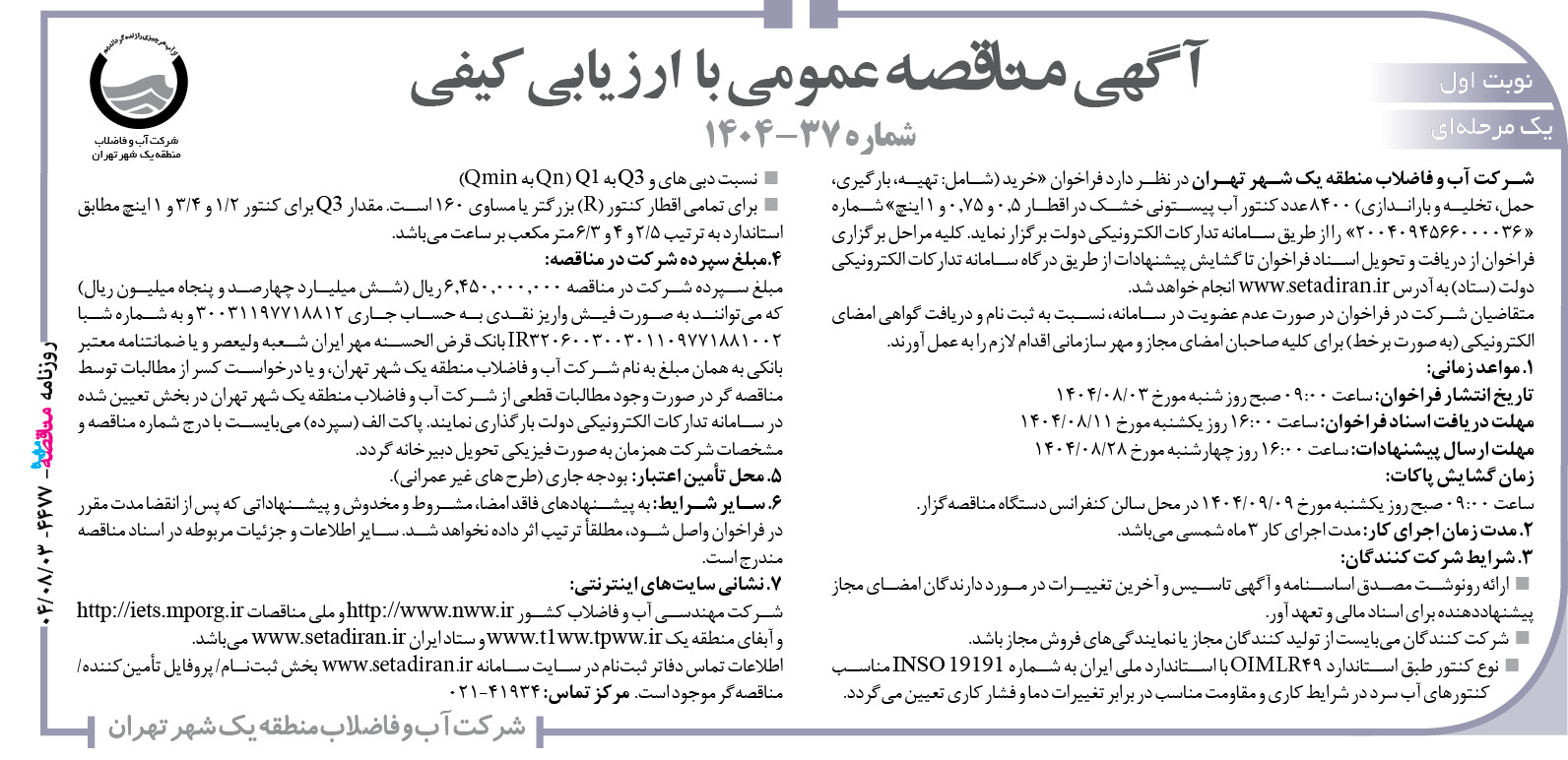شركت آب و فاضلاب منطقه يك شهر تهران در نظر دارد فراخوان «خرید (شامل: تهیه، بارگیری، حمل، تخلیه و باراندازی) ۸۴۰۰ عدد کنتور آب پیستونی خشک در اقطار ۰٫۵ و ۰٫۷۵ و ۱ اینچ» شماره ” ۲۰۰۴۰۹۴۵۶۶۰۰۰۰۳۶″ را از طريق سامانه تداركات الكترونيكي دولت برگزار نمايد. كليه مراحل برگزاري فراخوان از دريافت و تحويل اسناد فراخوان تا گشایش پيشنهادات از طريق درگاه سامانه تداركات الكترونيكي دولت (ستاد) به آدرس www.setadiran.ir انجام خواهد شد.