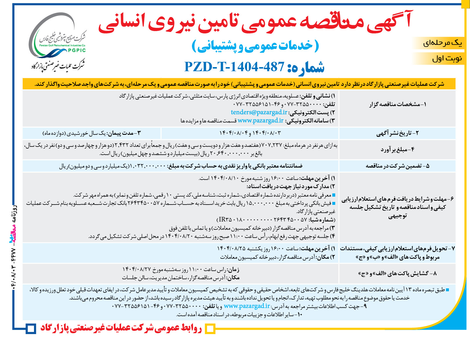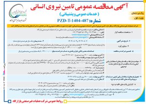 موضوع: آگهی مناقصهعمومی و یک مرحلهای تأمین نیروی انسانی (خدمات عمومی و پشتیبانی) شماره: PZD-T-1403-466 شركت عمليات غیر صنعتی پازارگاد در نظر دارد تامین نیروی انسانی (خدمات عمومی و پشتیبانی) خود را بهصورت مناقصهعمومی و یک مرحلهاي، به شركتهاي واجد صلاحيت واگذار کند. ۱- مشخصات مناقصهگزار ۱) نشانی و تلفن: عسلويه، منطقه […]