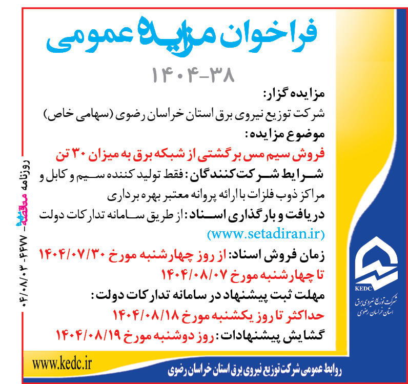 مزايده گزار: شرکت توزيع نيروي برق استان خراسان رضوي (سهامی خاص)