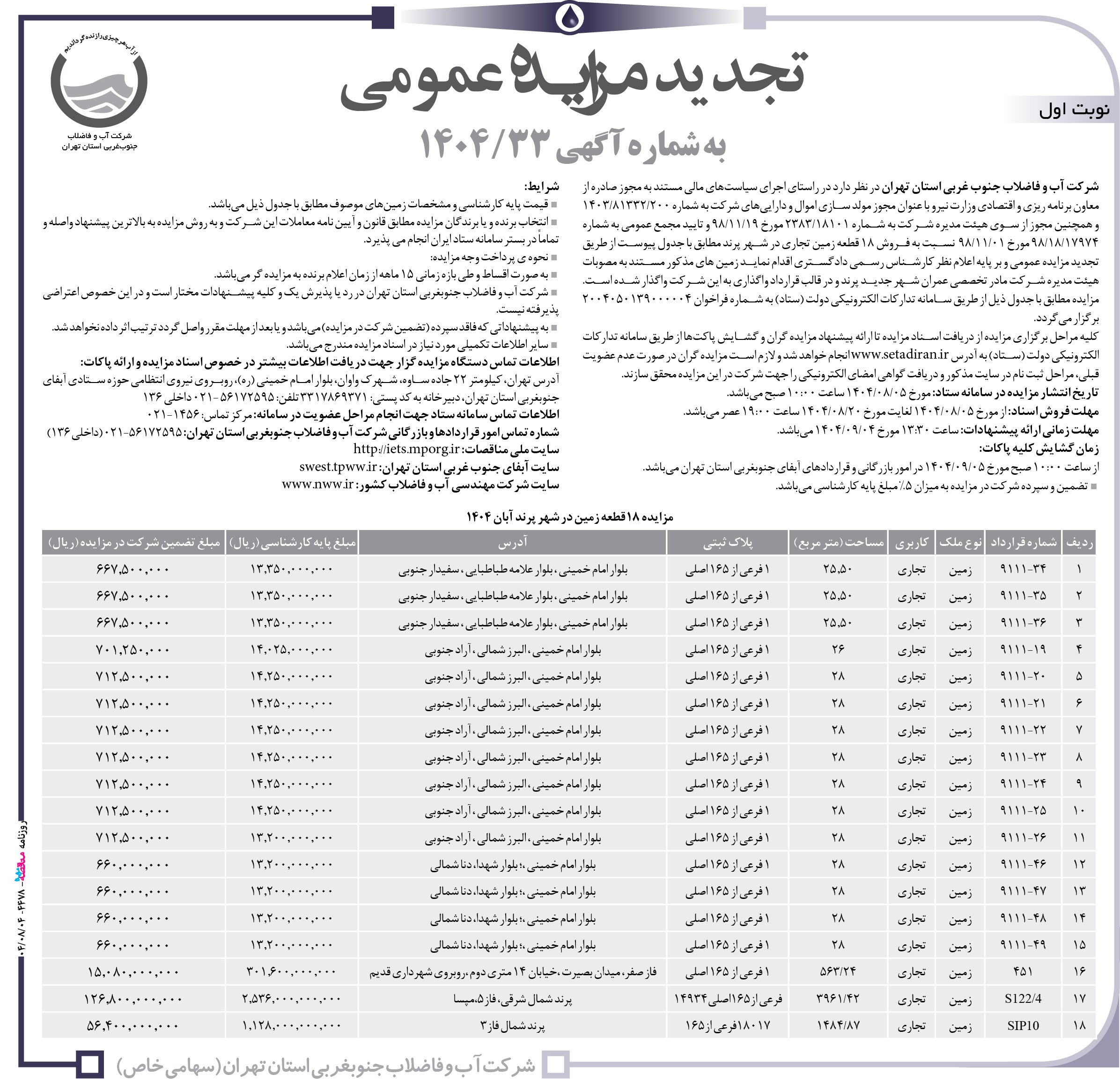 شرکت آب و فاضلاب جنوب غربی استان تهران در نظر دارد در راستای اجرای سیاستهای مالی مستند به مجوز صادره از معاون برنامه ریزی و اقتصادی وزارت نیرو با عنوان مجوز مولد سازی اموال و داراییهای شرکت به شماره ۲۰۰/۸۱۳۳۲/۱۴۰۳ و همچنین مجوز از سوی هیئت مدیره شرکت به شماره ۱۸۱۰۱/۲۳۸۳ مورخ ۱۹/۱۱/۹۸ و تایید مجمع عمومی به شماره ۱۷۹۷۴/۱۸/۹۸ مورخ ۰۱/۱۱/۹۸ نسبت به فروش ۱۸ قطعه زمین تجاری در شهر پرند مطابق با جدول پیوست از طریق تجدید مزایده عمومی و بر پایه اعلام نظر کارشناس رسمی دادگستری اقدام نماید زمین های مذکور مستند به مصوبات هیئت مدیره شرکت مادر تخصصی عمران شهر جدید پرند و در قالب قرارداد واگذاری به این شرکت واگذار شده است. مزایده مطابق با جدول ذیل از طریق سامانه تدارکات الکترونیکی دولت (ستاد) به شماره فراخوان ۲۰۰۴۰۵۰۱۳۹۰۰۰۰۰۴ برگزار میگردد. کلیه مراحل برگزاری مزایده از دریافت اسناد مزایده تا ارائه پیشنهاد مزایده گران و گشایش پاکتها از طریق سامانه تدارکات الکترونیکی دولت (ستاد) به آدرس www.setadiran.ir انجام خواهد شد و لازم است مزایده گران در صورت عدم عضویت قبلی، مراحل ثبت نام در سایت مذکور و دریافت گواهی امضای الکترونیکی را جهت شرکت در این مزایده محقق سازند.