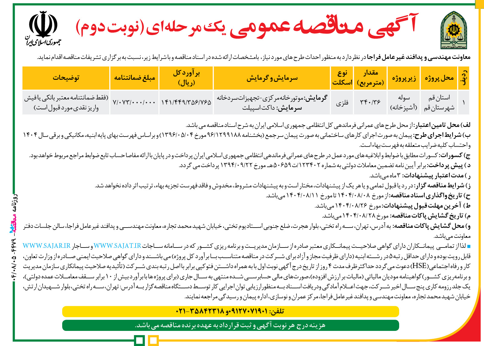 معاونت مهندسی و پدافند غیرعامل فراجا در نظردارد به منظور احداث طرح های مورد نیاز، بامشخصات ارائه شده در اسناد مناقصه و با شرايط زیر، نسبت به برگزاري تشريفات مناقصه اقدام نمايد.