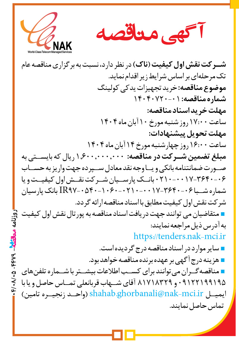 آگهی مناقصه شرکت نقش اول کیفیت (ناک) در نظر دارد، نسبت به برگزاری مناقصه عام تک مرحلهای بر اساس شرایط زیر اقدام نماید. موضوع مناقصه: خرید تجهیزات یدکی کولینگ شماره مناقصه: ۰۱-۱۴۰۴۰۷۲۰ مهلت خرید اسناد مناقصه: ساعت ۱۷:۰۰ روز شنبه مورخ ۱۰ آبان ماه ۱۴۰۴ مهلت تحویل پیشنهادات: ساعت ۱۶:۰۰ روز چهارشنبه مورخ ۱۴ آبان […]