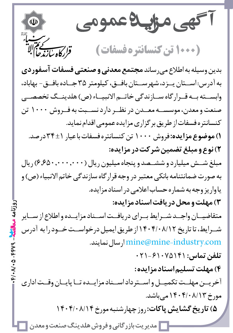 بدین وسیله به اطلاع میرساند مجتمع معدنی و صنعتی فسفات آسفوردی به آدرس: استان یزد، شهرستان بافق، کیلومتر ۳۵ جاده بافق- بهاباد، وابسته به قرارگاه سازندگی خاتم الانبیاء (ص) هلدینگ تخصصی صنعت و معدن، موسسه معدن در نظر دارد