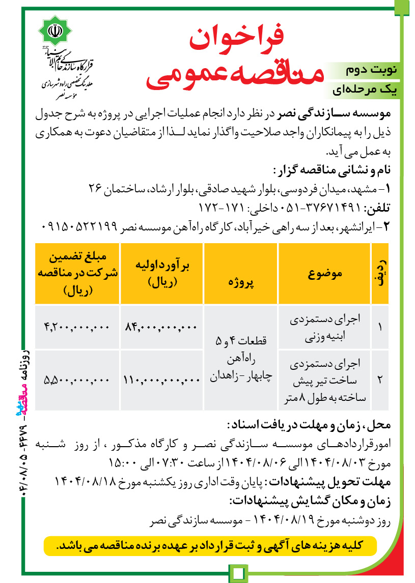 محل ، زمان و مهلت دریافت اسناد : امورقراردادهای موسسه سازندگی نصر و کارگاه مذکور ، از روز شنبه مورخ ۰۳/۰۸/۱۴۰۴ الی ۰۶/۰۸/۱۴۰۴ از ساعت ۰۷:۳۰ الی ۱۵:۰۰