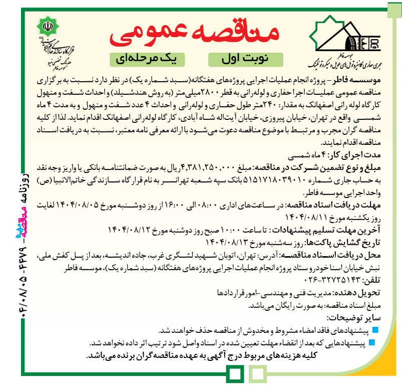 موسسه فاطر- پروژه انجام عملیات اجرایی پروژههای هفتگانه(سبد شماره یک) در نظر دارد نسبت به برگزاری مناقصه عمومی عملیات اجرا حفاری و لولهرانی به قطر۱۸۰۰میلیمتر (به روش هندشیلد) و احداث شفت و منهول کارگاه لوله رانی تونل C به مقدار :۱۲۰۰متر طول حفاری و لولهرانی و احداث ۱۲ عدد شفت و منهول و به مدت ۸ ماه شمسی واقع در تهران، تهرانپارس، اتوبان شهید زینالدین، حدفاصل خیابان الله اکبر، شهید زهدی و خیابان اسفندانی، کارگاه لولهرانی تونل C