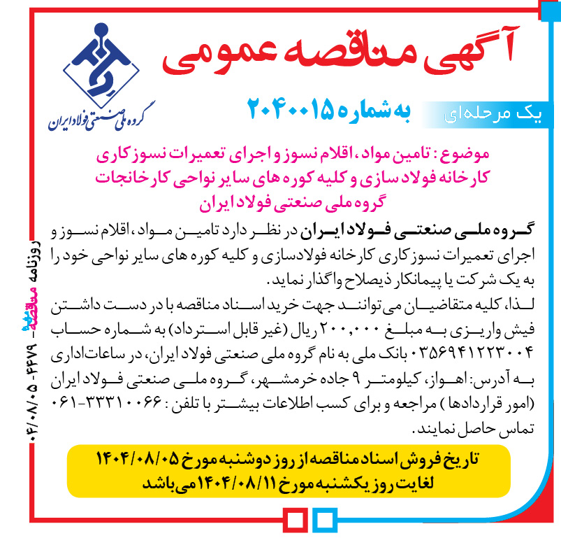 گروه ملي صنعتي فولاد ايران در نظر دارد تامين مواد ، اقلام نسوز و اجراي تعميرات نسوزكاري كارخانه فولادسازي و كليه كوره هاي ساير نواحي خود را به يك شركت يا پيمانكار ذيصلاح واگذار نمايد .