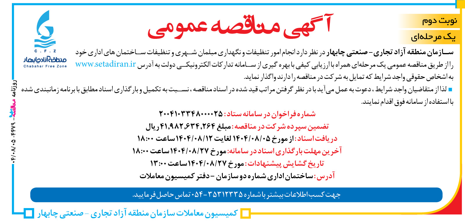 سازمان منطقه آزاد تجاری – صنعتی چابهار در نظر دارد انجام امور تنظیفات و نگهداری مبلمان شهری و تنظیفات ساختمان های اداری خود را از طریق مناقصه عمومی یک مرحلهای همراه با ارزیابی کیفی با بهره گیری از سامانه تدارکات الکترونیکی دولت به آدرس www.setadiran.ir به اشخاص حقوقی واجد شرایط که تمایل به شرکت در مناقصه را دارند واگذار نماید.