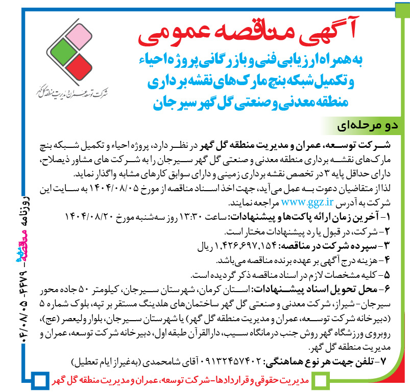آگهی مناقصه عمومی دو مرحلهای به همراه ارزیابی فنی و بازرگانی پروژه احیاء و تکمیل شبکه بنچ مارکهای نقشه برداری منطقه معدنی و صنعتی گل گهر سیرجان